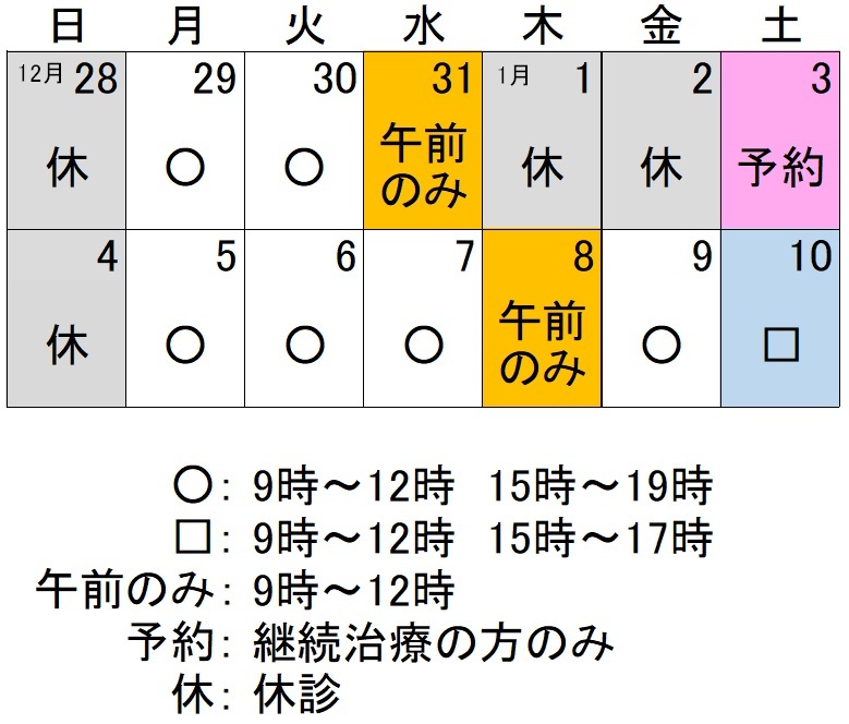 〇12月31日は継続治療の予約診療をいたします。